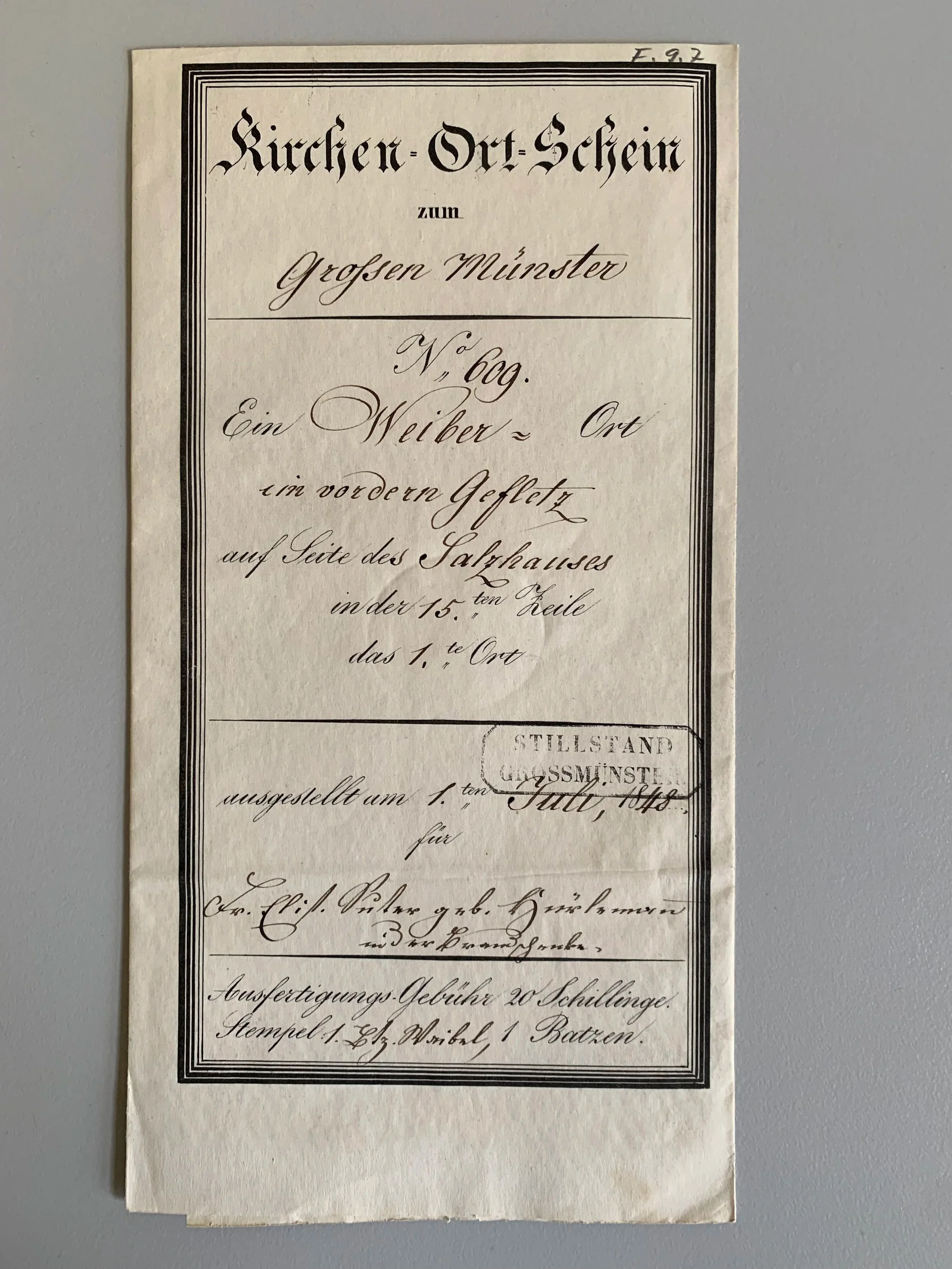 Hier ein Kirchenortsschein von jemandem aus der Familie Deiner Mutter (Hess) für das Grossmünster.